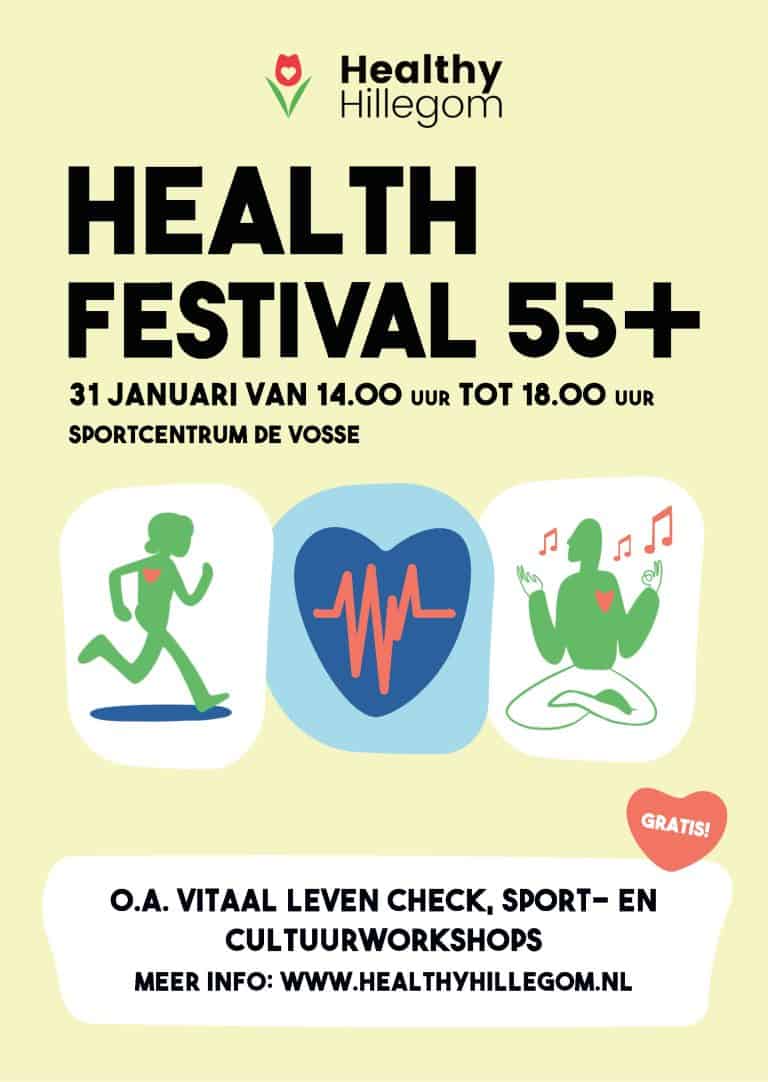 Ben je 55 jaar of ouder? Kom dan op zaterdag 31 januari naar het Health Festival van Healthy Hillegom! Doe mee aan de gratis Vitaal Leven Check, probeer sport- en cultuurworkshops en bezoek de vitaliteitsmarkt met lokale organisaties zoals Fietsmaatjes, Stichting Vrienden van Oud Hillegom en Voorieder1.